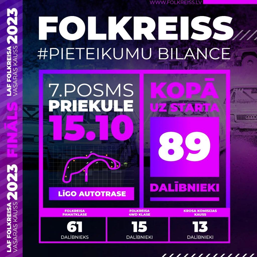 Svētdien Priekulē, Līgo trasē paredzēts aizvadīt Folkreisa Vasaras kausa un Krosa komisijas autokrosa kausa septīto posmu, kurš laikapstākļu dēļ tika atcelts nedēļu iepriekš Brenguļos. Par spīti datuma un ievērojamai ģeogrāfijas maiņai, sportisti nodemonstrējuši lieliskas pielāgošanās spējas, piesakoties gandrīz 90 braucēju sastāvā!