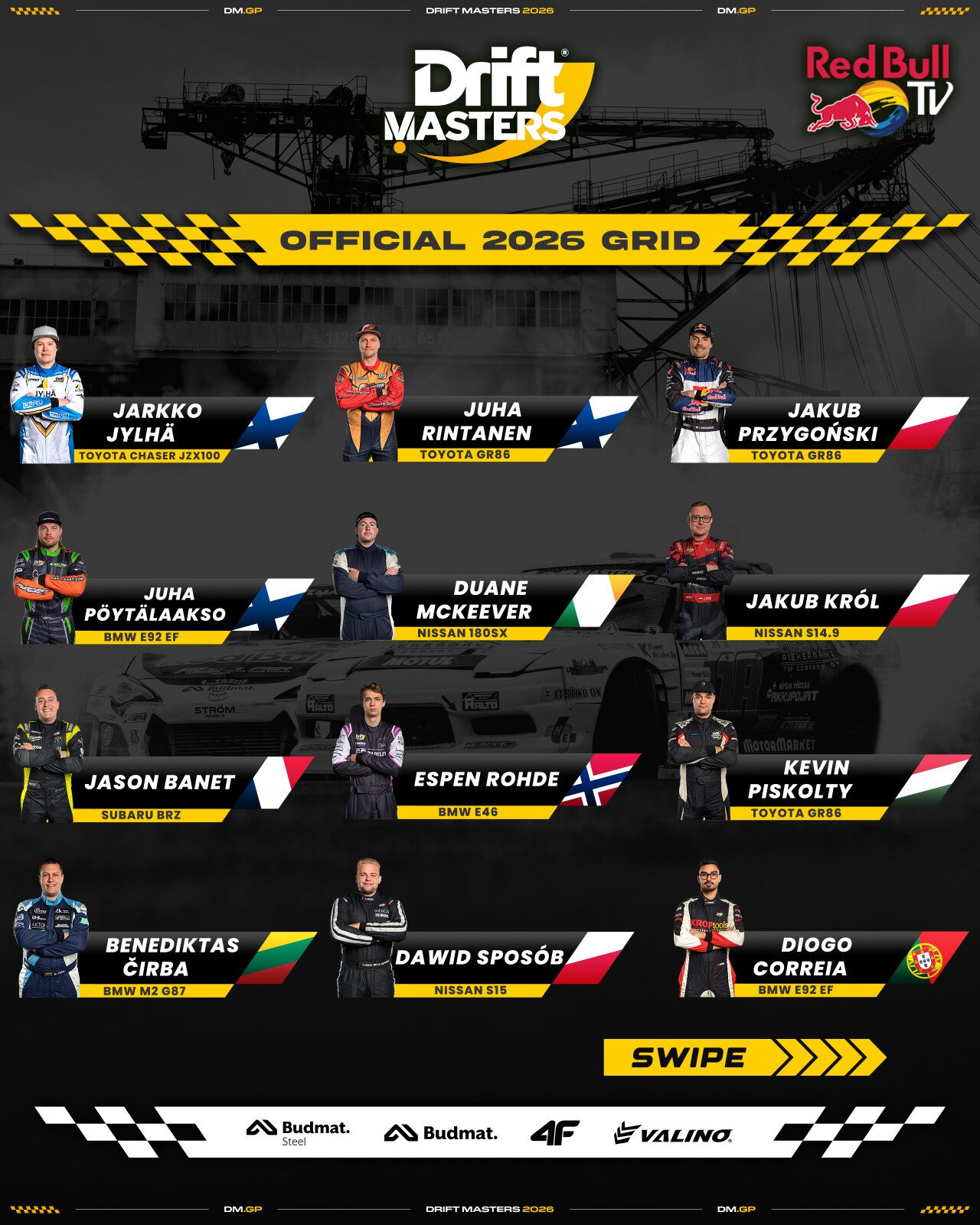 “Drift Masters” čempionāts ir oficiāli izziņojis 2026. gada sezonas braucēju sastāvu. Šogad tas būs īpašs ne tikai ar spēcīgu dalībnieku sastāvu, bet arī ar to, ka Rīgas posms atzīmēs savu desmito jubileju – “Drift Masters” Rīgā notiks desmito reizi.