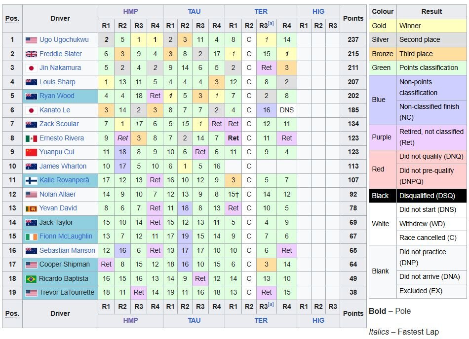 Čempionāta kopvērtējumā par titulu sīvi cīnās Rovanperas “Hitech” komandas biedri – britu talants Fredijs Sleiters un amerikānis Ugo Ugočukvu. Sleiters svētdien uzvarēja abos braucienos, kamēr Ugočukvu pēdējā startā pieļāva kļūdu un izslīdēja no trases.