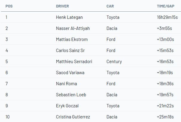 Otrajā vietā finišēja pieckārtējais Dakaras čempions Al-Atija, kamēr klientu komandas “Toyota Hilux” ekipāžas – tēvs un dēls Mareks un Eriks Goczali – ieņēma trešo un ceturto vietu. Piektajā vietā Lēbs nodrošināja stabilu dienu “Dacia” komandai, bet zaudēja Lateganam gandrīz 18 minūtes.