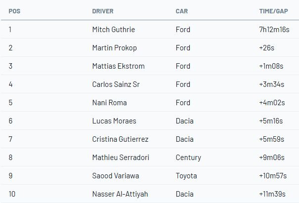 Otrajā vietā finišēja Martins Prokops ar klientu komandas “Ford Raptor”, nodrošinot “Ford” dubultuzvaru. Trešais bija “Toyota” pilots Gajs Boterils, kamēr “Dacia” piloti Nasers Al-Atija un Sebastjēns Lēbs piedzīvoja neveiksmīgu dienu, zaudējot vairāk nekā 20 minūtes.