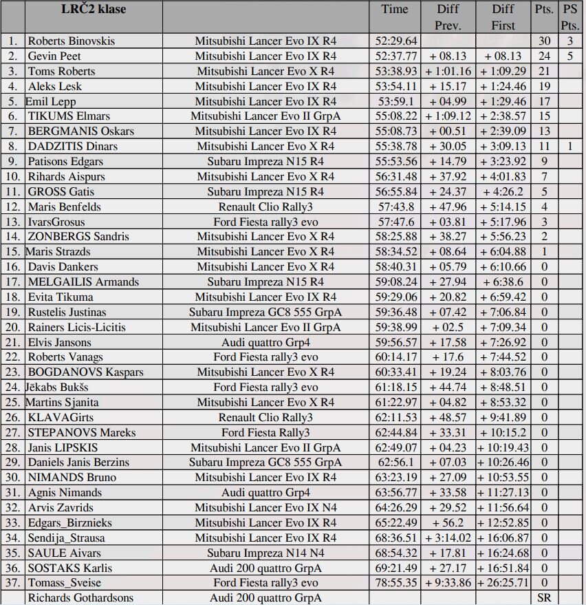 Savu pirmo uzvaru LRČ2 klasē svinēja Roberts Binovskis, ļoti tuvā cīņā, ar nieka 8 sekunžu atstarpi parepējot pieredzējušo Gevin Peet. Gevin jau pirmajā ātrumposmā izbrauca ārpus trase, zaudējot vērtīgas sekundes. Tas viņam lika palikt iedzinējos visu atlikušo ralliju. Par trešo vietu izvērtās aizraujoša cīņa starp trīs pilotiem, no kuriem ātrākais Toms Roberts, iegūstot vērtīgus kopvērtējuma punktus. Ceturtajā vietā Aleks Lesk, kuram pieļautā kļūda SS3 neļāva pacīnīties par augstāku vietu.
