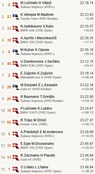 Visas šīs trīs ekipāžas uzvarēja savās klasēs. Ločmelis/Vējiņš triumfēja 4WD+ klasē, Vahejoe/Madisonam pirmā vieta “4WD Rookie” vērtējumā, kamēr Apfelbaums/Kohs sezonu iesākuši ar triumfu “2WD Open” kategorijā. Citās klasēs uzvaras sasniedza E.Zuģickis/K.Zuģickis (“Mitsubishi Lancer Evo IX”, “4WD Open”), R.Zalcmanis/H.Plaudis (“Audi A4”, 4WD), E.Balodis/K.Balodis (“Mini”), J.Lige/S.Kūsiks (“BMW 330 Compact”, “2WD Rookie”), R.Trūps/M.Dīriņš (“Honda Civic”, 2000), A.Blūmfelds/K.Eberhards (“Honda Civic”), U.Ābna A.Meoss (“Ford Fiesta”, “Juniori”) un K.Dzenīte/B.Brokāne (“BMW 316 c”, “Studenti”).
