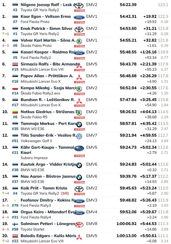 Ar sesto vietu absolūti un pirmo EMV5 ieskaitē ralliju noslēdza Sirmača/Bites (“Mitsubishi Lancer Evo VIII”) ekipāža, kas līdz ar to nodrošinājusi 2025. gada Igaunijas čempionu titulu. Savā klasē šodien latvieši uzvarēja sešos no septiņiem ātrumposmiem, bet finišā tuvāko sekotāju Allanu Popovu uzveica par 4.9 sekundēm. Popovs pirms šī posma vēl arī pretendēja uz titulu, kopvērtējumā ieņemot otro pozīciju.