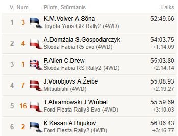Stabilu un labu sniegumu nodemonstrēja Jānis Vorobjovs/Artūrs Žeibe (“Mitsubishi Mirage”), kuri jau piektdien bija pacēlušies uz piekto vietu, bet pēc Seska neveiksmes iekārtojās ceturtajā pozīcijā, tajā arī sasniedzot finišu. Latvijas rallija kausa LRK5 grupas ieskaitē Vorobjovam uzvara un tikai piecu sekunžu pietrūka līdz Alenam, kurš startēja ar ievērojami jaudīgāku auto. Tāpat Vorobjovam/Žeibem trešā vieta LRČ1 grupā, aiz Volvera un Domžalas.