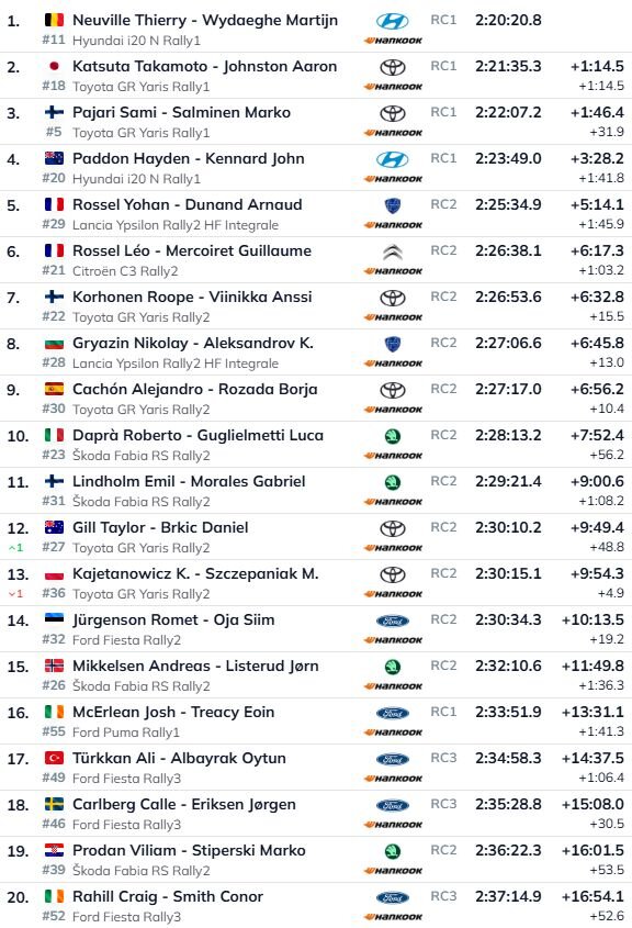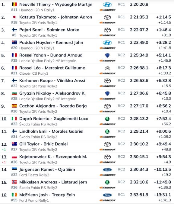 Pirmo piecinieku absolūtajā vērtējumā noslēdz WRC2 līderis Johans Rosels. Tagad uz otro vietu pacēlies Leo Rosels, kurš viņam zaudē virs minūtes, bet trešais ir Rope Korhonens. Nikolajam Grjazinam SS14 nomuka turbīnas truba, kas lika atkrist uz ceturto vietu. Vēl gan viss nav zaudēts – Korhonens ir tikai 13 sekundes priekšā.