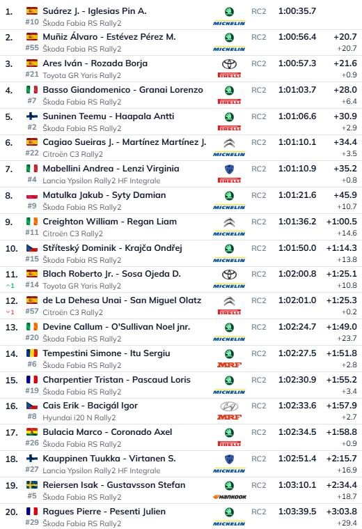 Otro vietu ieņem Alvaro Muniss ar “Škoda Fabia RS Rally2”, kuram vien 0.9 sekundes zaudē Ivans Floress ar “Toyota GR Yaris Rally2” – šim pilotam gan pēcpusdienas tveicē radās šaubas par auto uzvedību. Savukārt ceturtajā pozīcijā ierindojas leģendārais itālis Džandomeniko Baso. Tikai 2.9 sekundes tālāk ir somu zvaigzne Tēmu Suninens, kuram šis ir pirmais ERC starts pēdējo 11 gadu laikā.