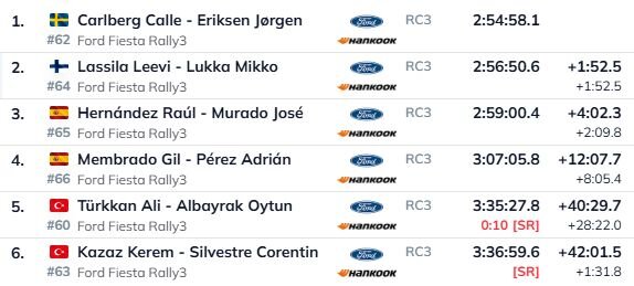Aiz “Top 3” palika divi piloti, kas savas rallija gaitas sākuši Latvijā. Spānis Gils Membrado ieņēma ceturto vietu, bet Kerems Kazazs, kurš piektajā ātrumposmā izstājās pēc avārijas, bet pēc tam atgriezās, finišā bija sestais.