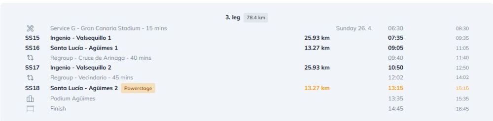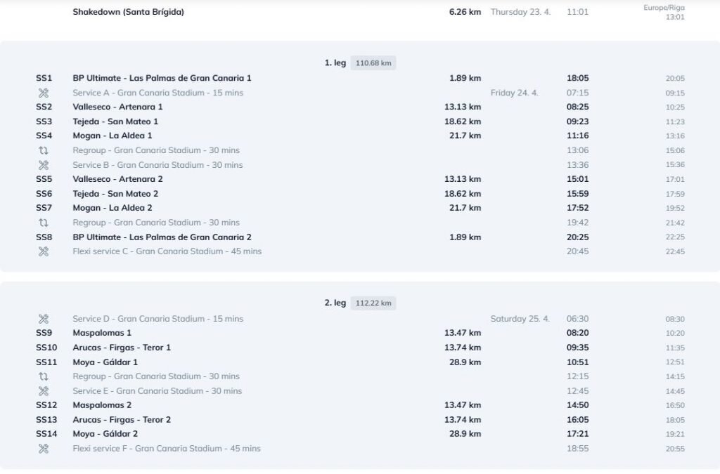 Jubilejas rallijs sastāvēs no 18 ātrumposmiem, kopumā mērojot aptuveni 301 km. Jau šovakar paredzēts superspeciālais rallija atklāšanas ātrumposms Grankanārijas stadionā, kur trase izveidota ārkārtīgi šaura. Piektdien sekos kalnu ātrumposmu sērija, kur svarīga būs riepu nodiluma pārvaldība uz abrazīvā asfalta. Sestdiena būs garākā sacensību diena, bet svētdien norisināsies izšķirošā cīņa par punktiem un “Power Stage”.