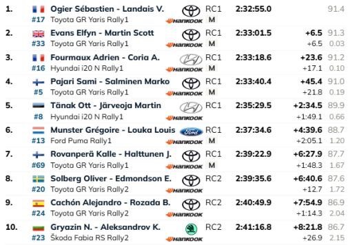 Kamēr “Toyota” braucēji cīnās par uzvaru, trešajā vietā atrodas Adriens Furmo, kurš šajā nedēļas nogalē demonstrēja vislabāko veikumu no “Hyundai” komandas trijotnes. Turklāt no līdera viņš atpaliek ne pārāk daudz – 23.6 sekundes. Sami Pajari dienas sākumā uzslīdēja valnim, bet turpināja, nezaudējot daudz laika un dienas beigās ir ceturtais. Vientuļā piektajā pozīcijā ralliju turpina Ots Tanaks, tālāk Greguārs Munsters, bet Kalle Rovanpera šīs dienas laikā no 17. vietas pēc piektdienas avārijas pacēlies uz septīto pozīciju šobrīd.