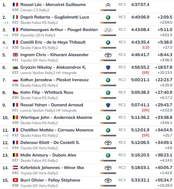 Otro vietu “Škoda Fabia RS Rally2” automašīnā ieņēma Roberto Dapra, bet par lielāko pārsteigumu parūpējās Arturs Pelamurgs, kurš savā WRC2 debijā izcīnīja trešo vietu, apsteidzot pieredzējušo Eriku Kamillī. Vēl pirms pēdējā dopa Kamillī atradās otrajā vietā, taču saņēma 3 minūšu un 20 sekunžu sodu par pamatīgu nokavēšanos laika kontrolē, kas viņu atmeta uz ceturto pozīciju.