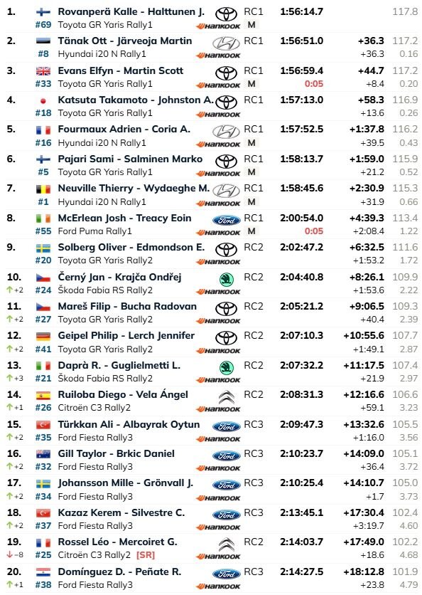 Rovanpera pēc tam vairs daudz neriskēja, noturot komfortablu pārsvaru. Šobrīd 36.3 sekundes viņam zaudē Ots Tanaks, bet 44.7 sekundes atpaliek Elfins Evanss. Šī trijotne aizvien atrodas cīņā par WRC titulu.