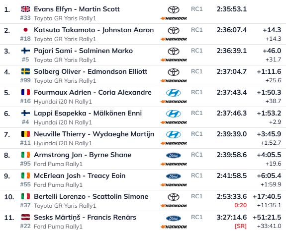Kaut ko vērā ņemamu likt pretī Evansam svētdienas ātrumposmos sāncenši nespēja, kā tas jau bija prognozējams. Velsietis arī uzvarēja dienas pirmajā ātrumposmā un finišā pārspēja Katsutu par 14.3 sekundēm. Labu un stabilu ralliju aizvadīja Sami Pajari, nepielaižot sev bīstami tuvu Solbergu un izcīnot trešo vietu, kas ir viņa vien otrais pjedestāls kopš kļūšanas par “Rally1” klases pilotu. Solbergs šoreiz pēc ne tik laba sacensību sākumā spēja finišēt drošā ceturtajā pozīcijā.