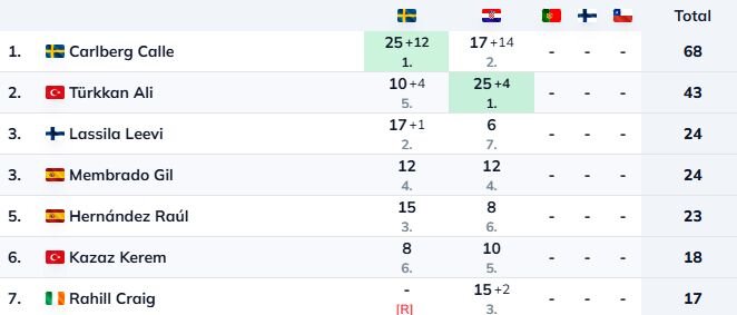 Zīmīgi, ka Karlbergs no Horvātijas aizbrauca ar lielāku punktu skaitu nekā uzvarētājs, jo “Junior WRC” ieskaitē punkti tiek piešķirti arī par katru uzvarētu ātrumposmu. Karlbergs visā rallijā bija ātrākais 14 dopos, kas viņam ļāva saglabāt vadību čempionāta kopvērtējumā ar 68 punktiem, kamēr Turkans pakāpās uz otro pozīciju ar 43 punktiem.